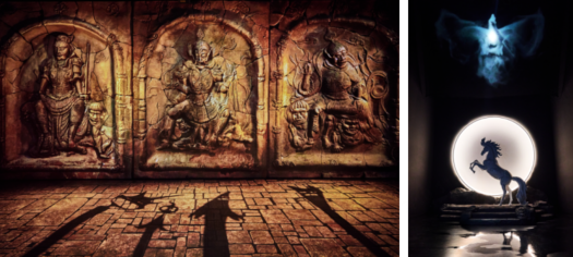 “守護者”(左圖)和“居西干”(右圖)等展區也以引人入勝的視覺效果,帶領參觀者沉浸于新羅的傳奇歷史之中(圖片由Flashbackground Co., Ltd.提供)