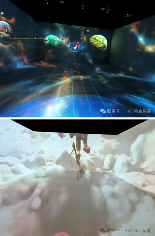 不同于單一墻面投影,這里的投影覆蓋了墻面 + 地面:訪客站在空間中央,會被星際、云海、城市景觀全方位包裹 —— “踩在云里” “身處星際航道” 的體感,讓客戶從 “看展示” 變成 “走進打印場景”,品牌記憶點直接拉滿。