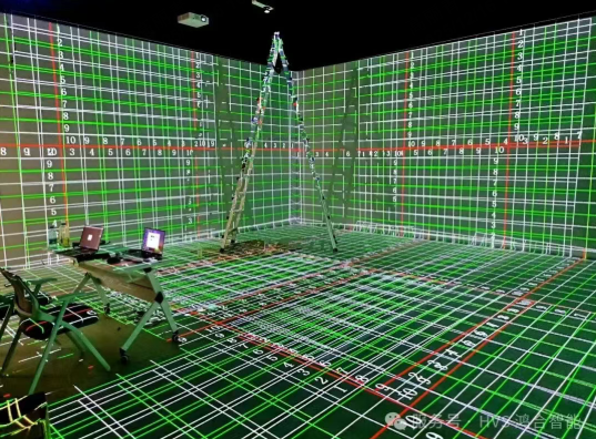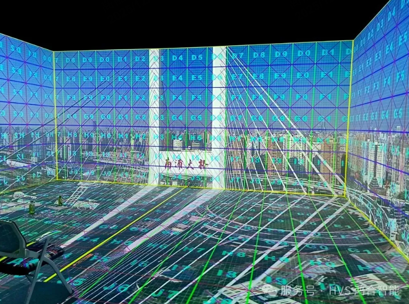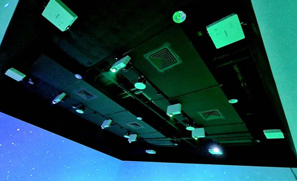 要實現墻面 + 地面的全域投影,12 臺設備的畫面拼接是核心難點。HT-L752UA 的精準融合能力,讓調試時的 “網格校準” (圖中綠色定位線) 最終化作 “無邊界” 的視覺體驗:從這臺機器投射的 “星球” ,能自然銜接另一臺機器的 “星云帶”,地面云海與墻面星際場景無縫銜接,全程無斷層、無色彩偏差。
