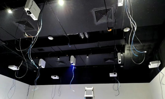 從現場圖可見,展廳天花板布滿管線、通風設備,但 HT-L752UA 支持靈活安裝,能適應不同吊裝角度與緊湊布局 —— 12 臺設備按設計要求在天花板有序排布,既隱藏了硬件痕跡,又確保每一束光都精準覆蓋墻面與地面的展示區域,讓 “科技感” 從硬件細節延伸到體驗的滿足。