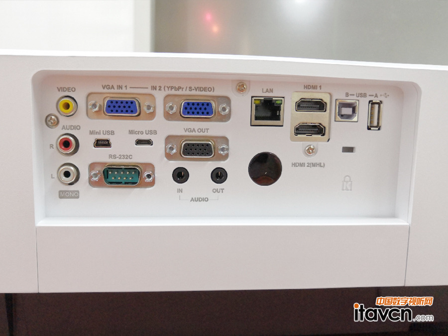 寶視來SU648接口全面,包括HDMI×2、VGA×2、VGA out、Video、Audio、USB-A、USB-B、Micro USB、Mini USB、LAN等?梢赃B接多個設備進行投影,使投影更加方便;