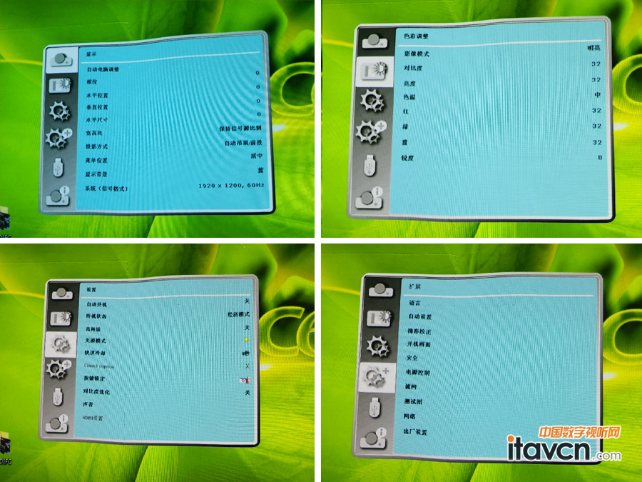 參數(shù)設(shè)置界面,自動(dòng)電腦調(diào)整、相位、水平位置、垂直位置、水平尺寸、寬高比、投射方式、影像模式、對(duì)比度、亮度、色溫等調(diào)節(jié)功能。