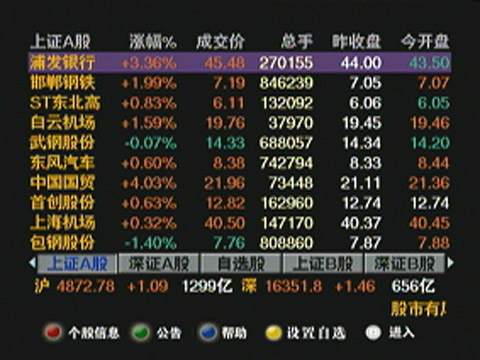 性能描述:支持股票行情分類;包括上證A股;深圳A股;自選股;上證B股;深圳B股;權(quán)證板塊;上證基金;深圳基金;上證國(guó)債;深證國(guó)債;上證指數(shù);深證指數(shù);三版和排行循環(huán)切換; 支持300天日K線數(shù)據(jù),240個(gè)點(diǎn)的分時(shí)數(shù)據(jù); 播�